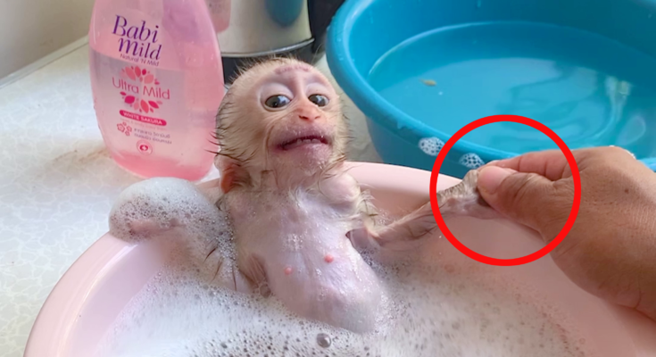 Baby monkeys, like human infants, need special care because their skin is delicate and their bodies are still developing. Warm water plays a crucial role by maintaining the baby’s body temperature. If the water is too cold, the little one may become stressed or frightened; if it is too hot, it can cause discomfort or irritation. The ideal approach is to prepare a basin or small tub with comfortably warm water—similar to the warmth used for bathing a newborn human child.
